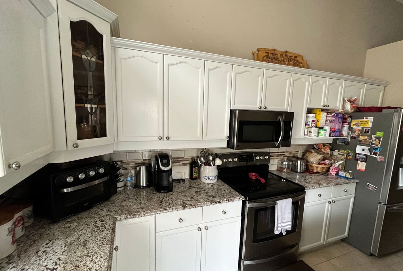 We remove doors and drawers, mask all surfaces, clean and sand thoroughly, then spray-apply your new finish using high-quality coatings and equipment.